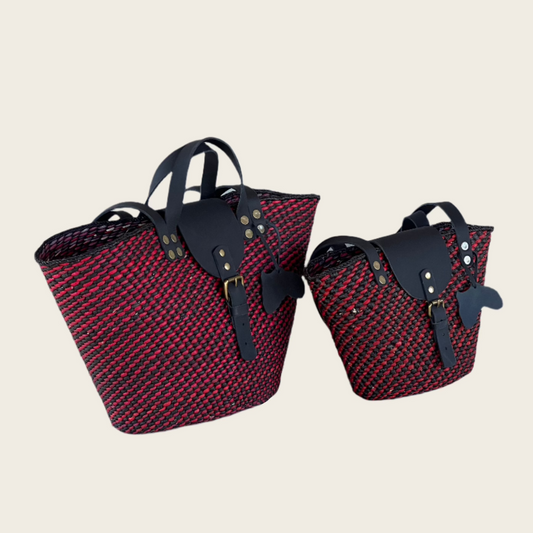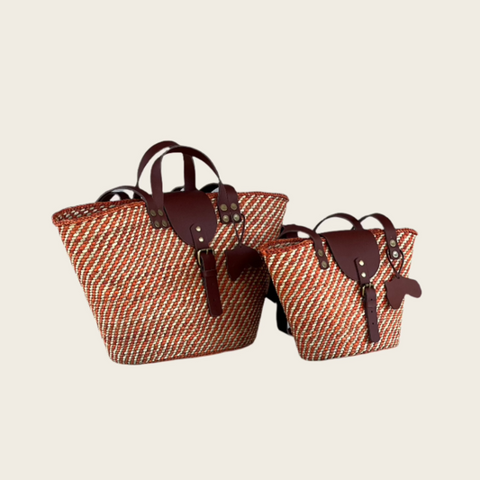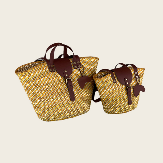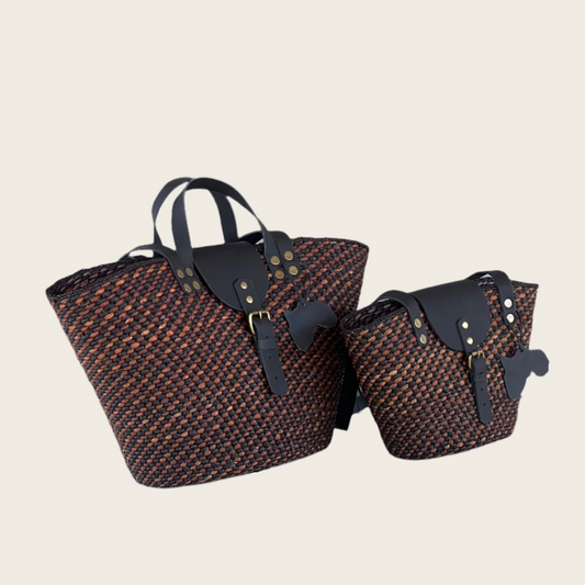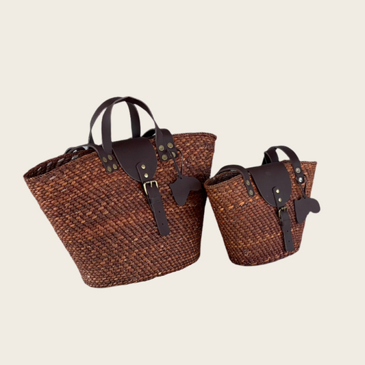 The environmentally-friendly reed grass called "Milulu" is used for weaving the bags. The "Milulu" grows near streams, and the local women uproot, clean, and dry these grasses before using them for weaving the bags. We combine the skillfully hand-woven bags with elements of high-quality Tanzanian leather. We carefully add the leather by hand to ensure the quality of the final product.